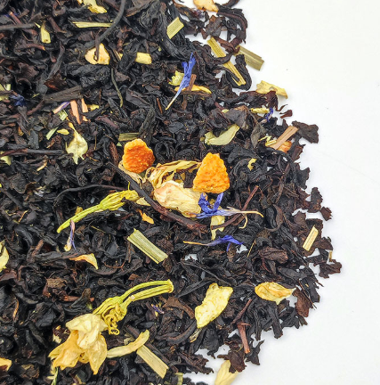 Классический черный индийский чай с маслом бергамота, а также с добавлением цветов жасмина, василька, лемонграсса и цедры апельсина.
