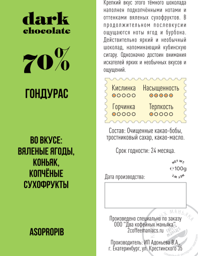 Удивительное дело. Первый раз пробуем шоколад из Гондураса и он очень характерен кофе из Гондураса. Вот прямо присущие кофе крепость, терпкость явно гондурасская). Во вкусе копчёно-вяленые нотки. Послевкусие отменное - в нём и коньяк и вино и ягоды. Идеальное сочетание для десерта - чашка кофе Гондурас Копан, шоколад Гондурас и кубинская сигара. Столько крепости и ароматной терпкости у вас за вечер больше не будет!)