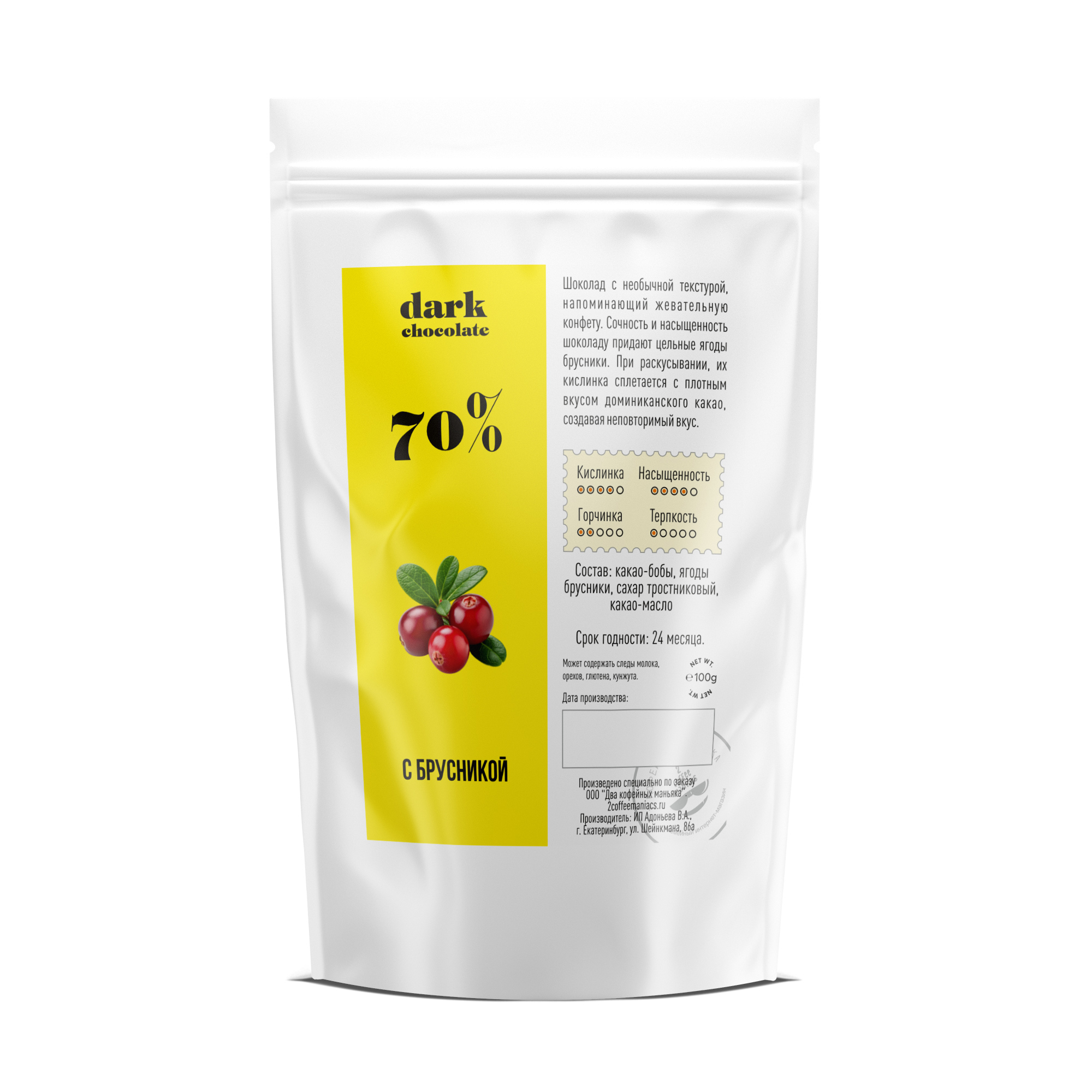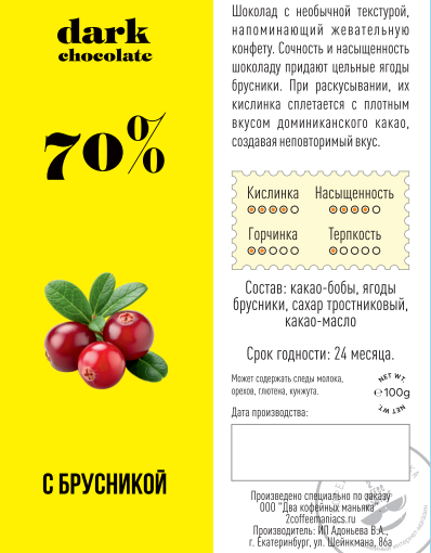 Шоколад с необычной текстурой, напоминающий жевательную конфету. Цельные ягоды брусники придают сочность и насыщенность. При раскусывании, их кислинка сплетается с плотным вкусом доминиканского какао, создавая неповторимый вкус, напоминающий ликёрные конфеты.